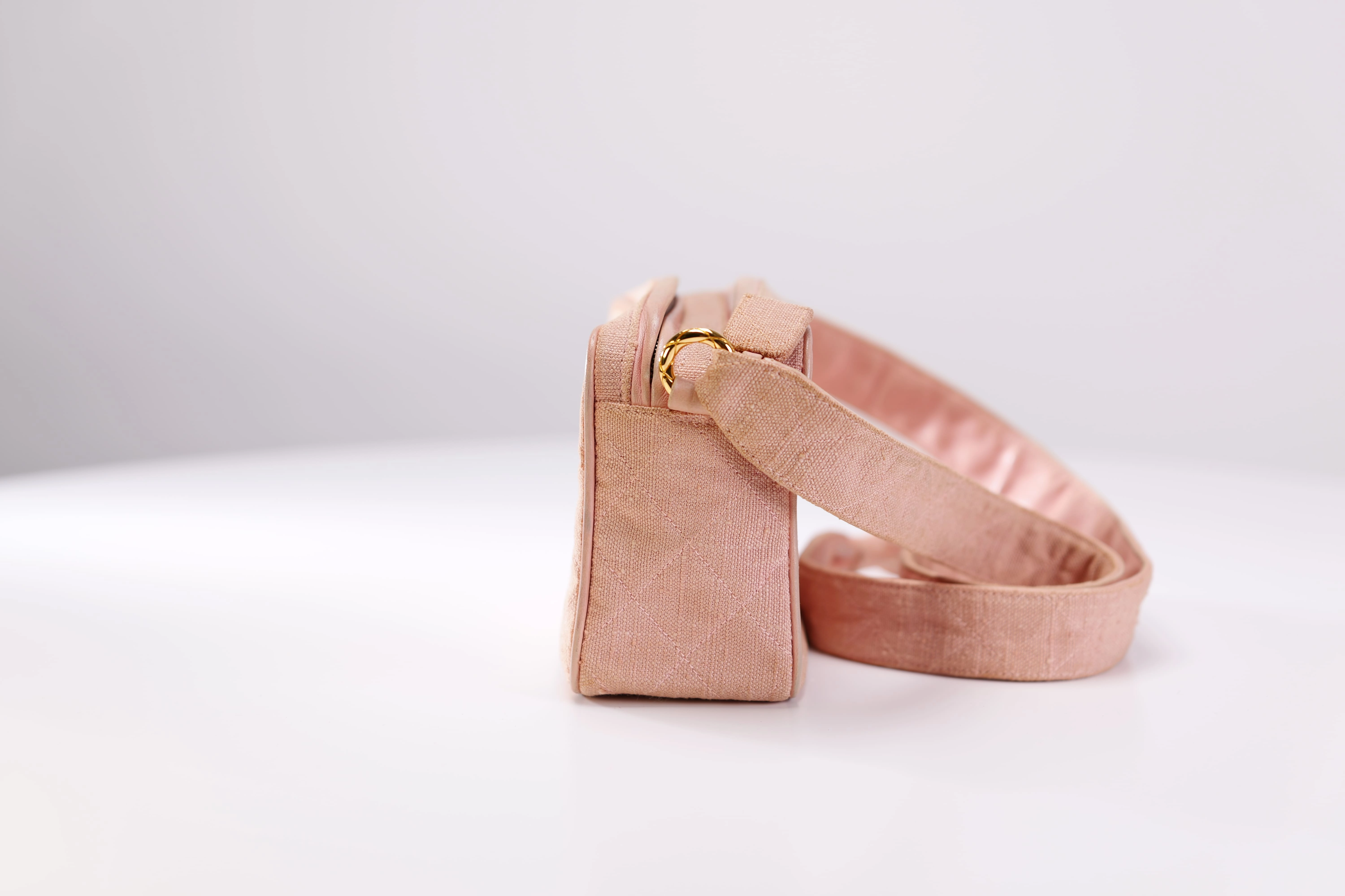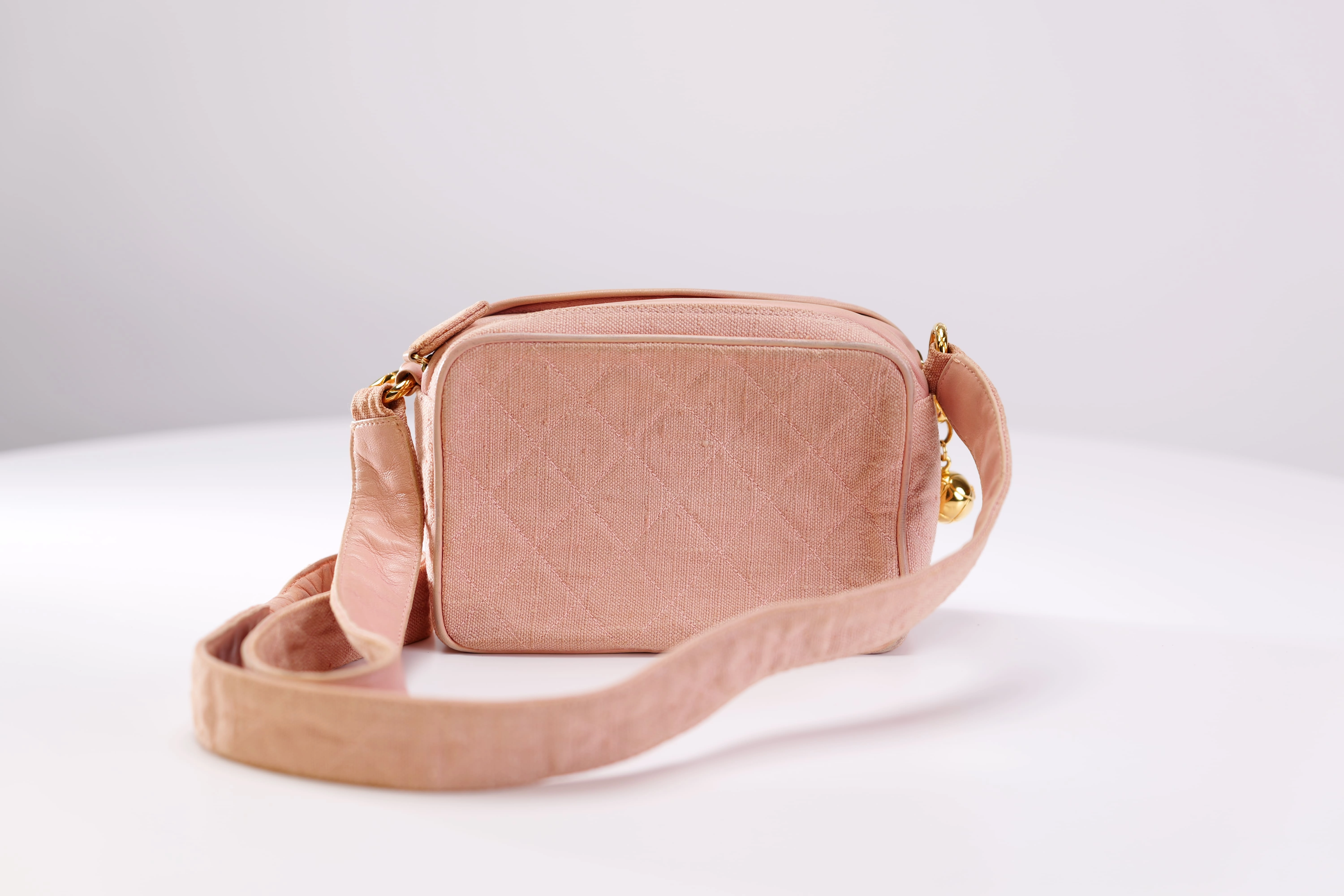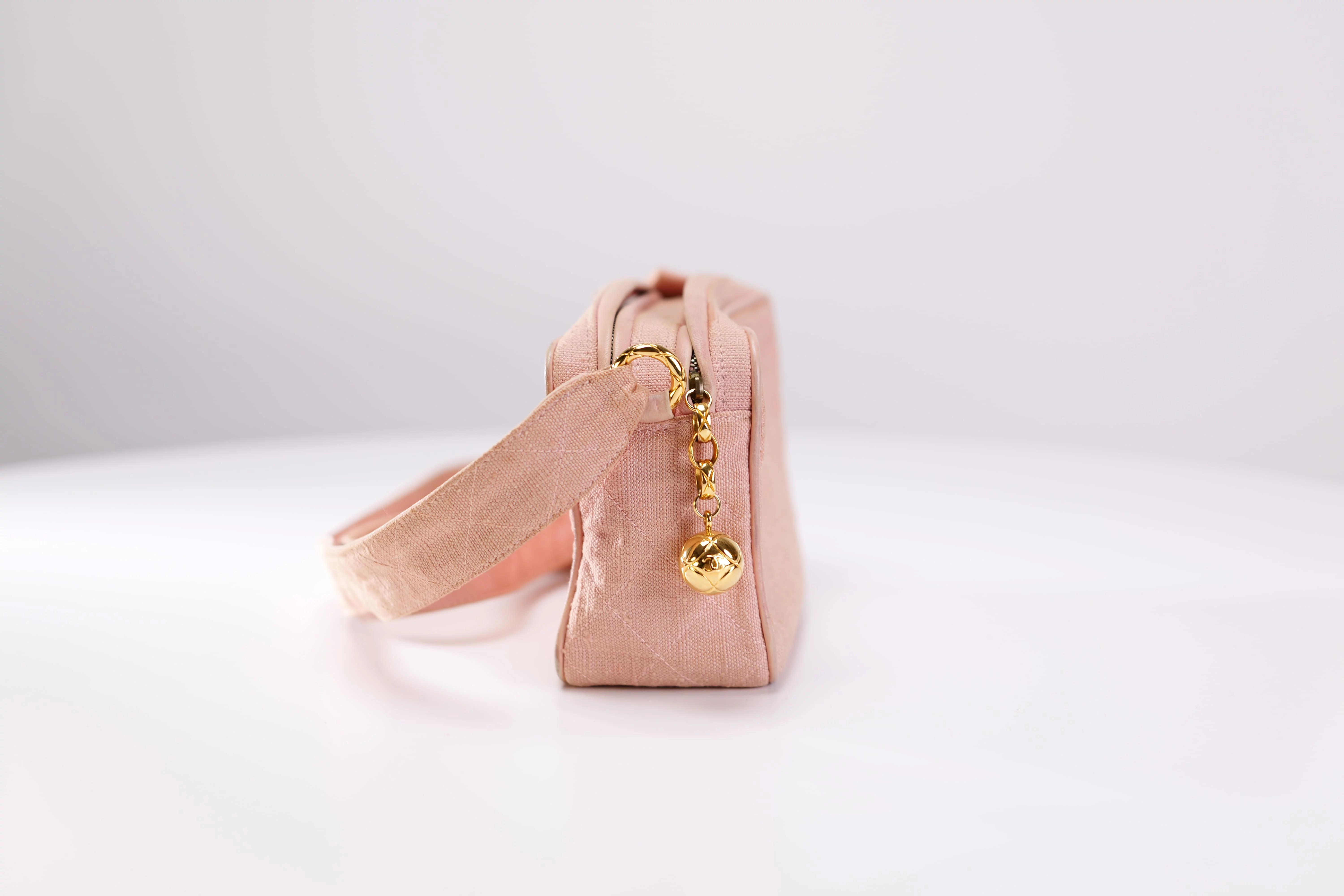 柔和的淡粉色包身上,以同色系的車線縫製了巨大的經典 Logo
