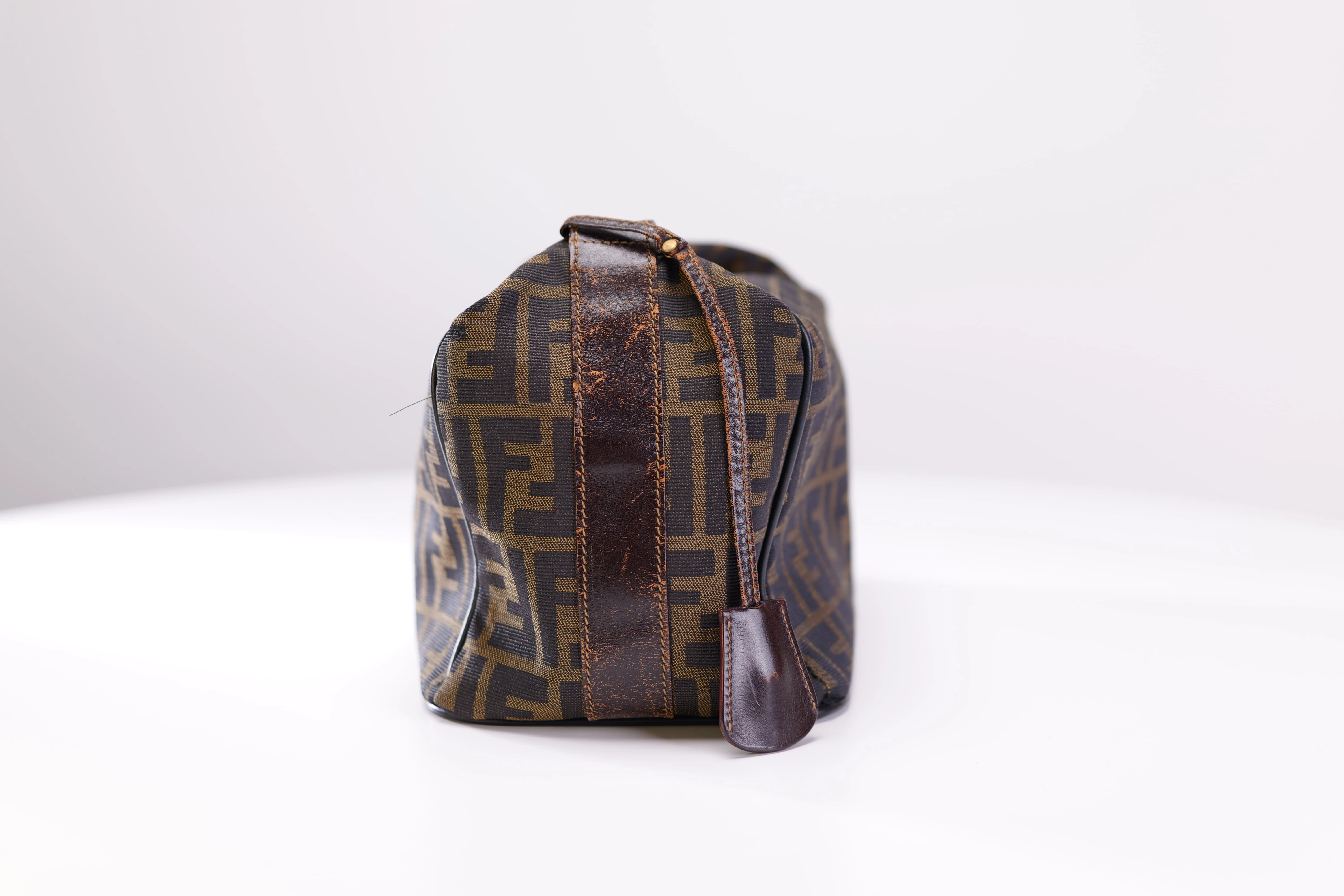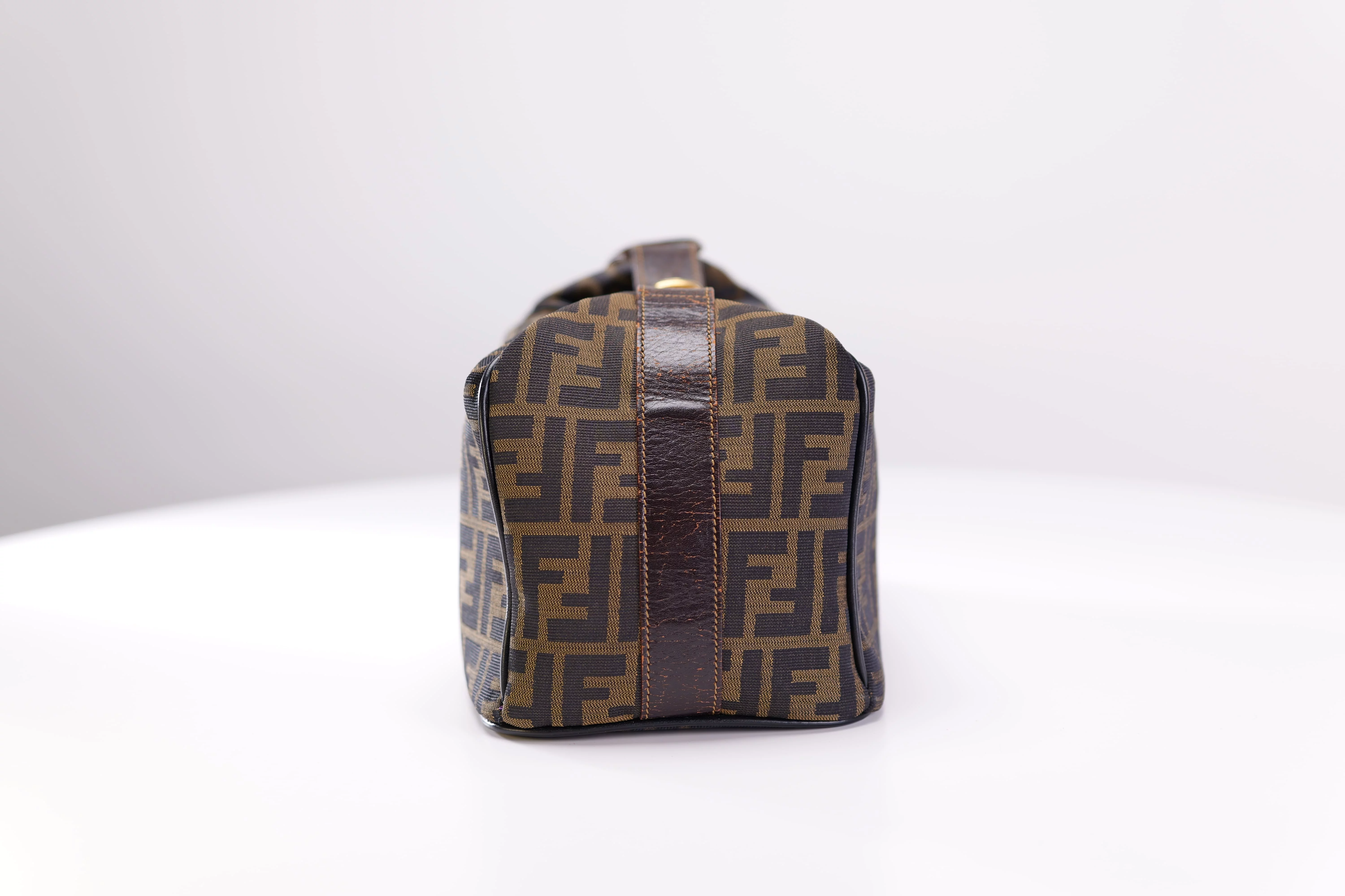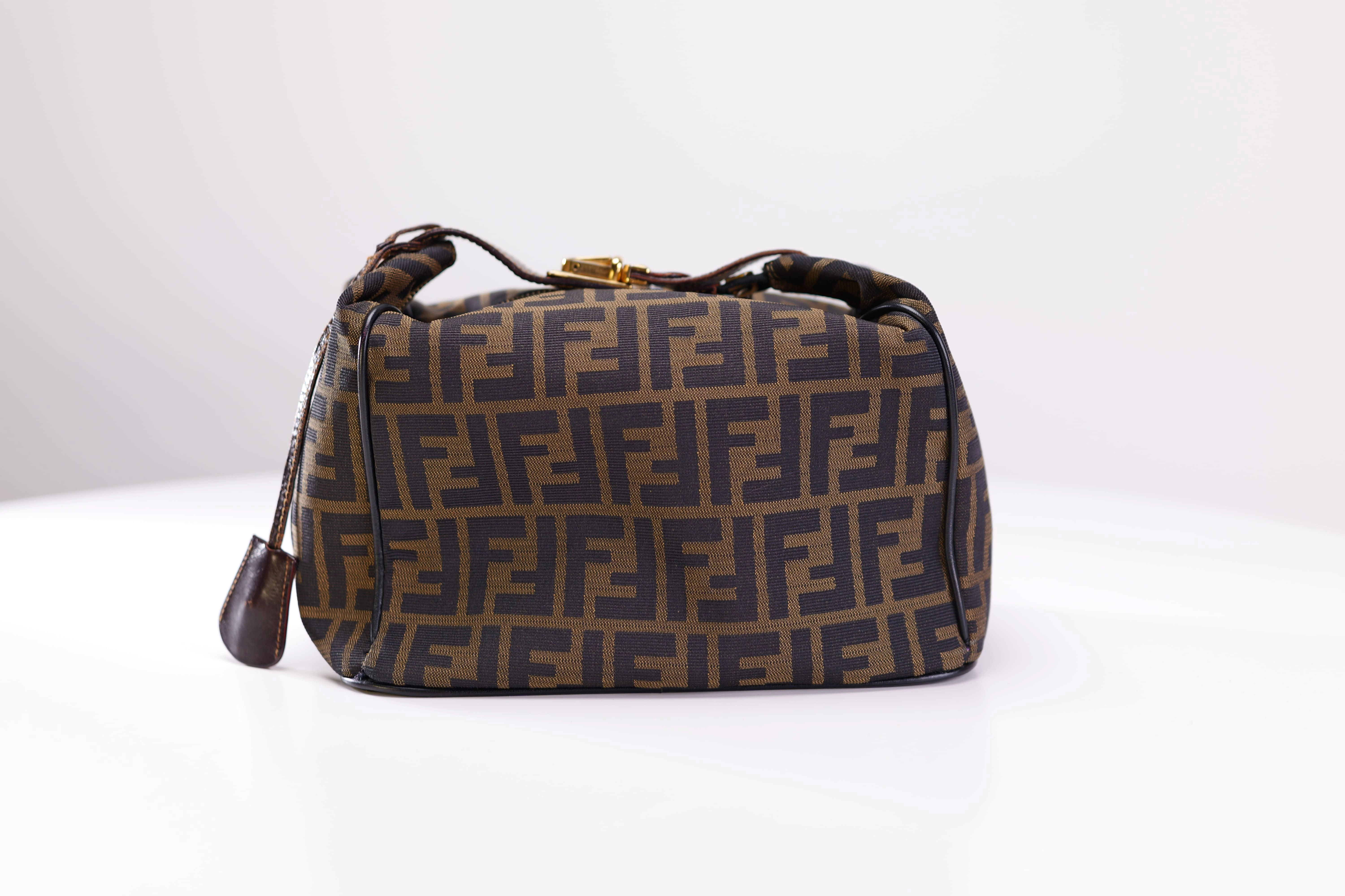 "採用經典的深棕色緹花編織帆布 這種材質輕盈且具有一定的防刮耐磨特性 是早期 FENDI 包款的招牌用料 包包的邊角使用了深棕色的皮革滾邊來維持立體輪廓 頂部則配有一條穿過金屬扣的皮革手提帶"